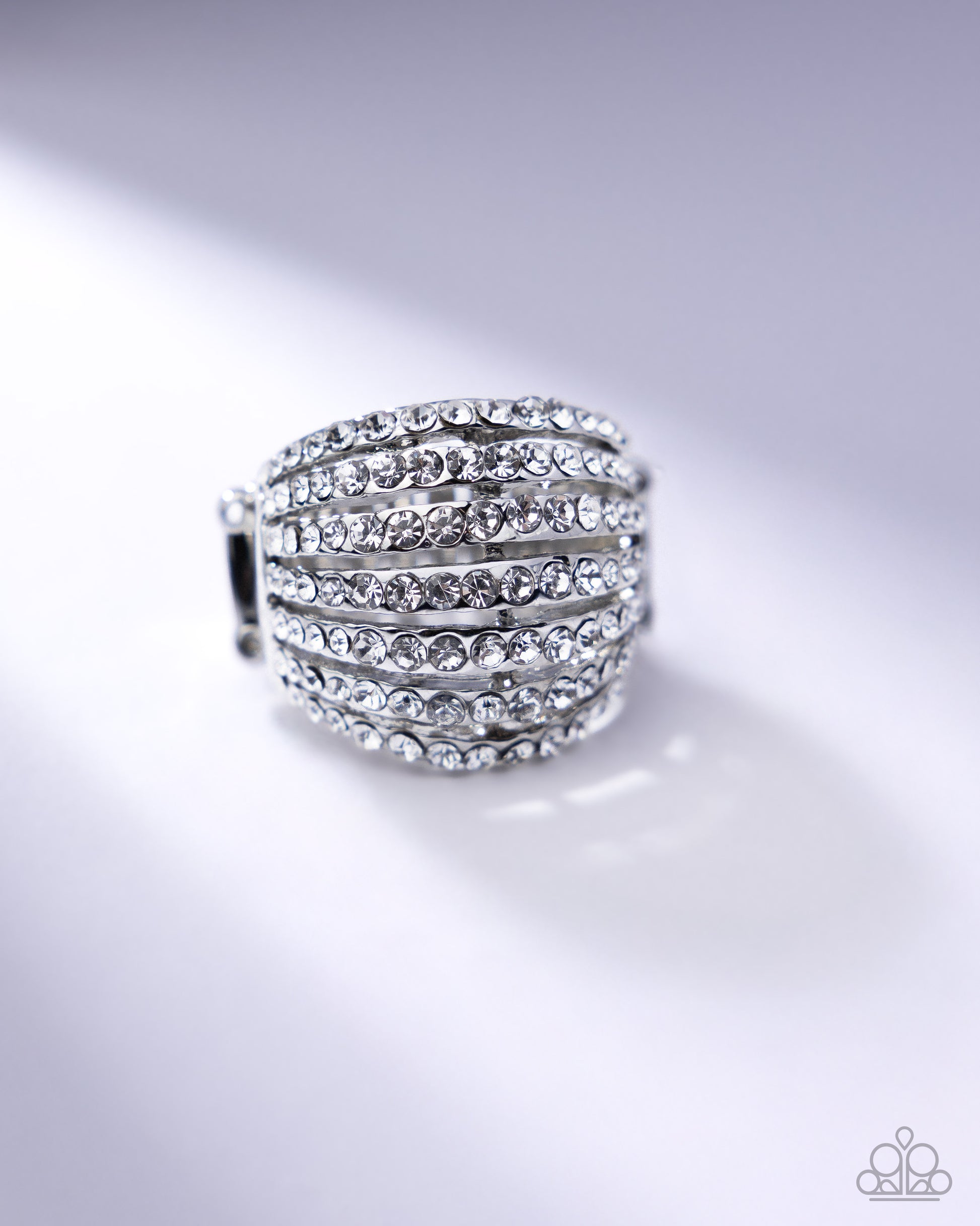 Row after row of incandescent white rhinestones stack into a dazzling display. The gorgeous rounded bands and undeniable sparkle create a regal statement piece. Features a stretchy band for a flexible fit.