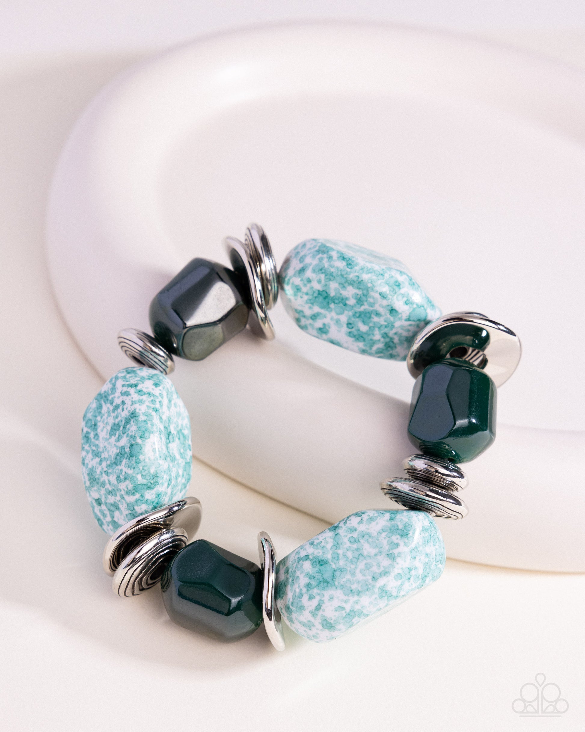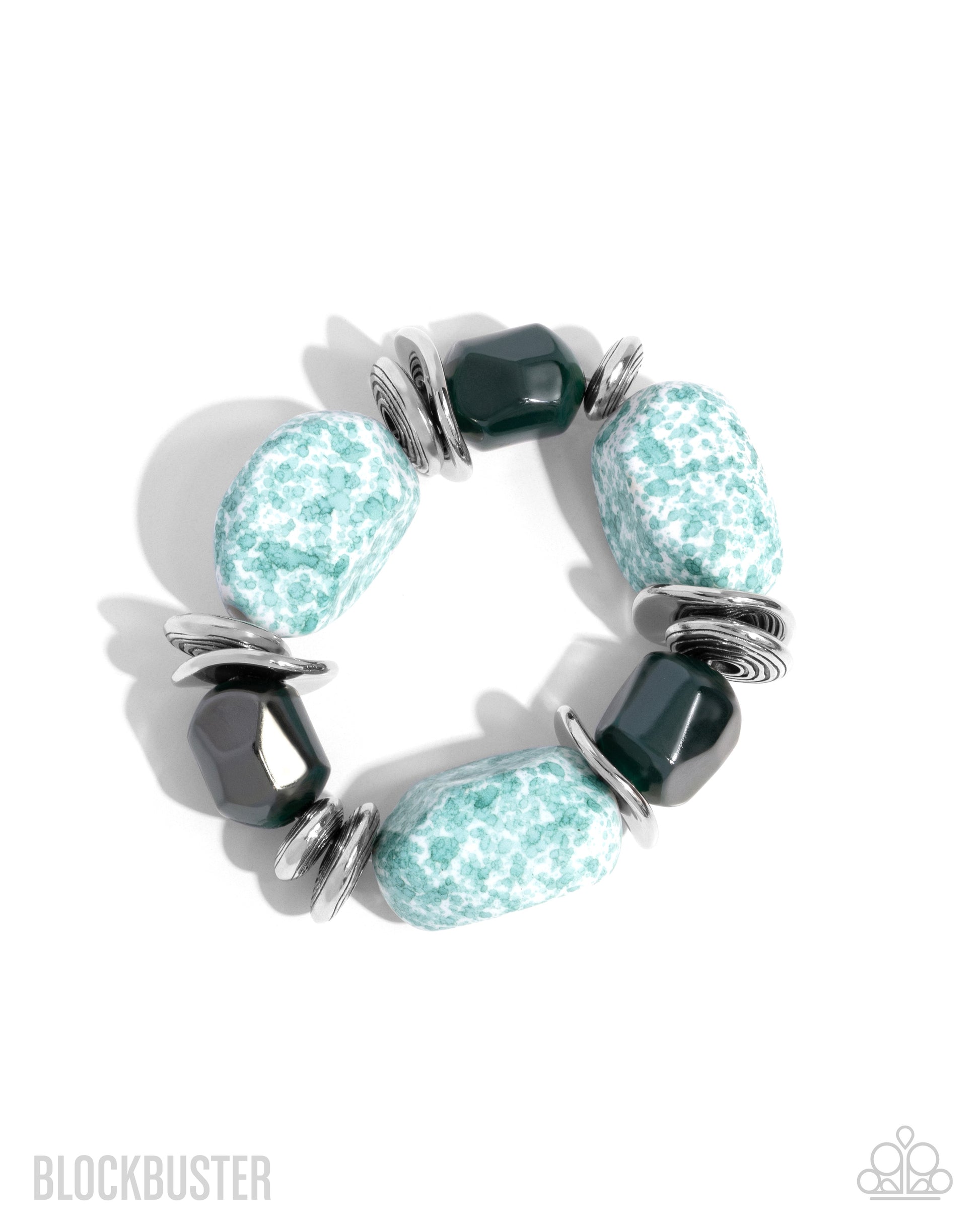 Infused along a stretchy elastic band, abstract chunky white beads with speckles of blue alternate with solitaire abstract blue beads with a gorgeous glazed finish and double layers of thick textured silver rings, creating an eye-catching, engaging display along the wrist.