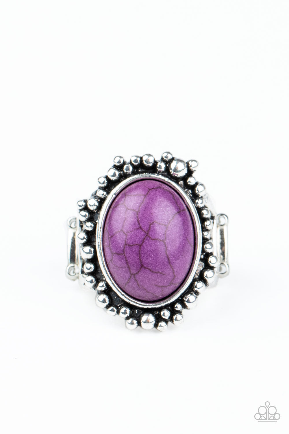 An oval Magenta Purple stone is pressed into a rustic silver frame radiating with antiqued silver studs, creating an earthy centerpiece atop the finger. Features a stretchy band for a flexible fit.