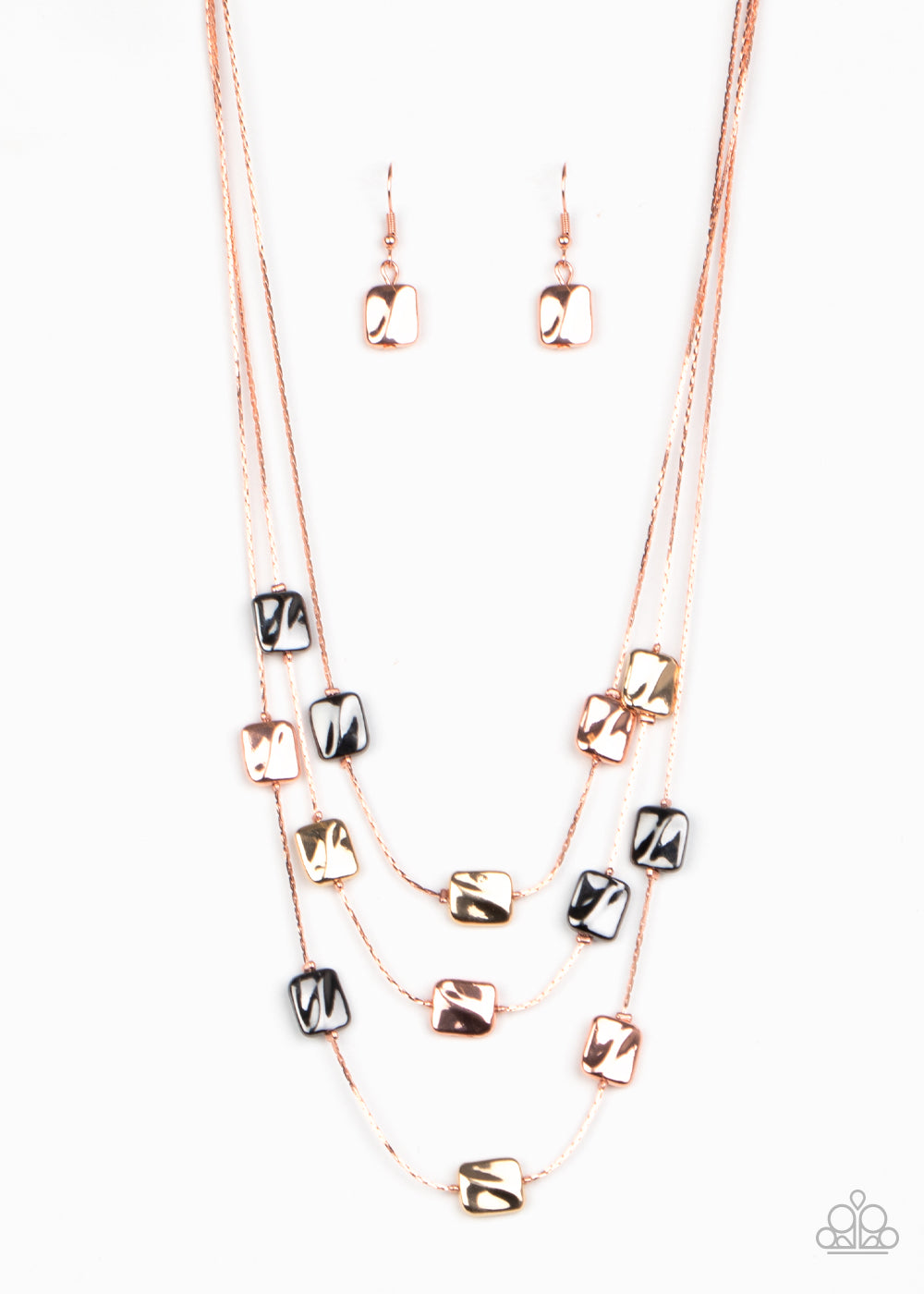 Featuring a decorative surface, dainty shiny copper, gunmetal, and gold rectangular accents are fitted in place along three sleek shiny copper chains, creating refined layers below the collar. Features an adjustable clasp closure.