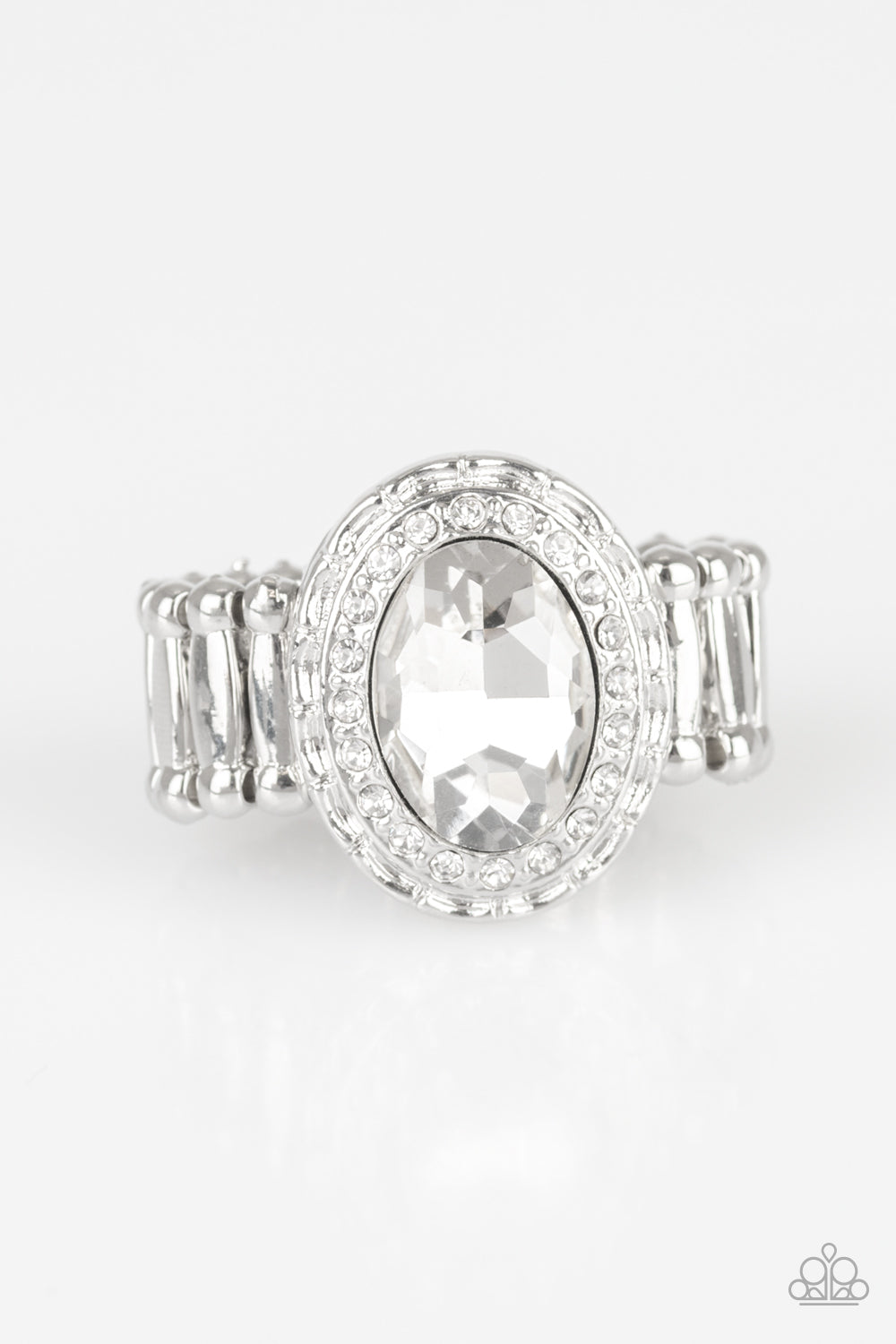A faceted white gem is pressed into the center of a textured silver frame radiating with glassy white rhinestones for a refined look. Features a stretchy band for a flexible fit.