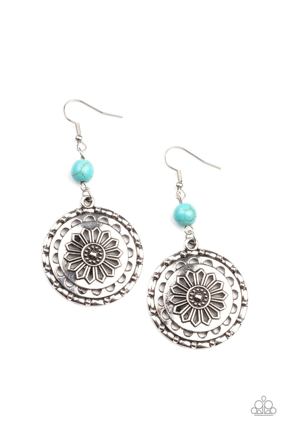 A refreshing turquoise stone bead gives way to a studded silver frame embossed in a whimsical daisy pattern, creating a rustic lure. Earring attaches to a standard fishhook fitting.