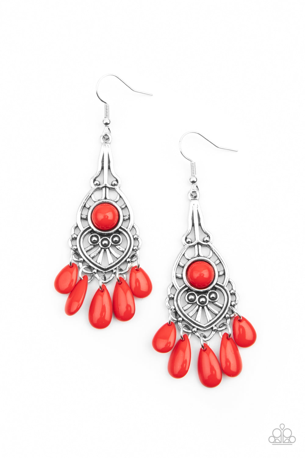 Fiery red teardrop beads swings from the bottom of an ornately studded silver frame featuring a bubbly red beaded center for a fruity finish. Earring attaches to a standard fishhook fitting.