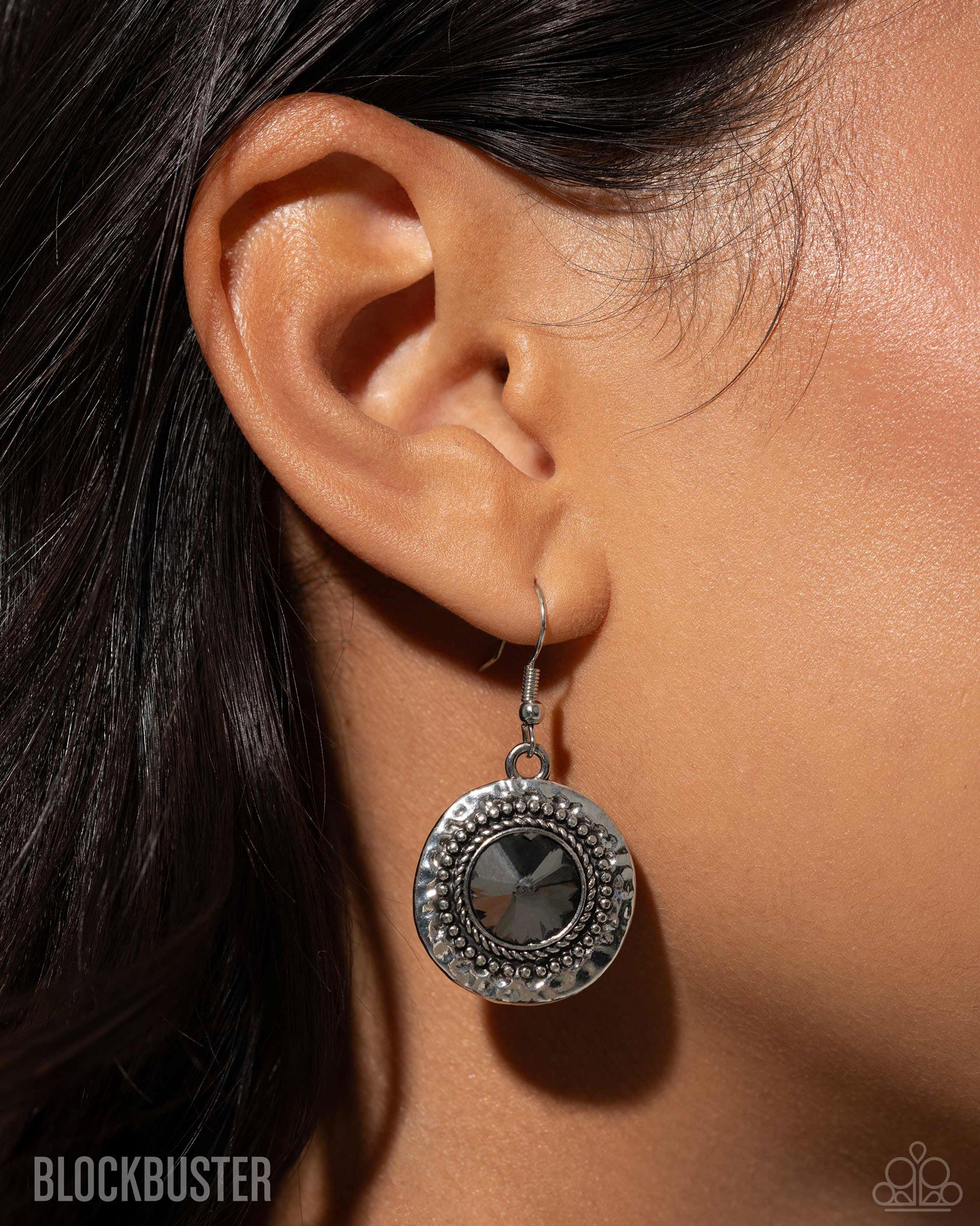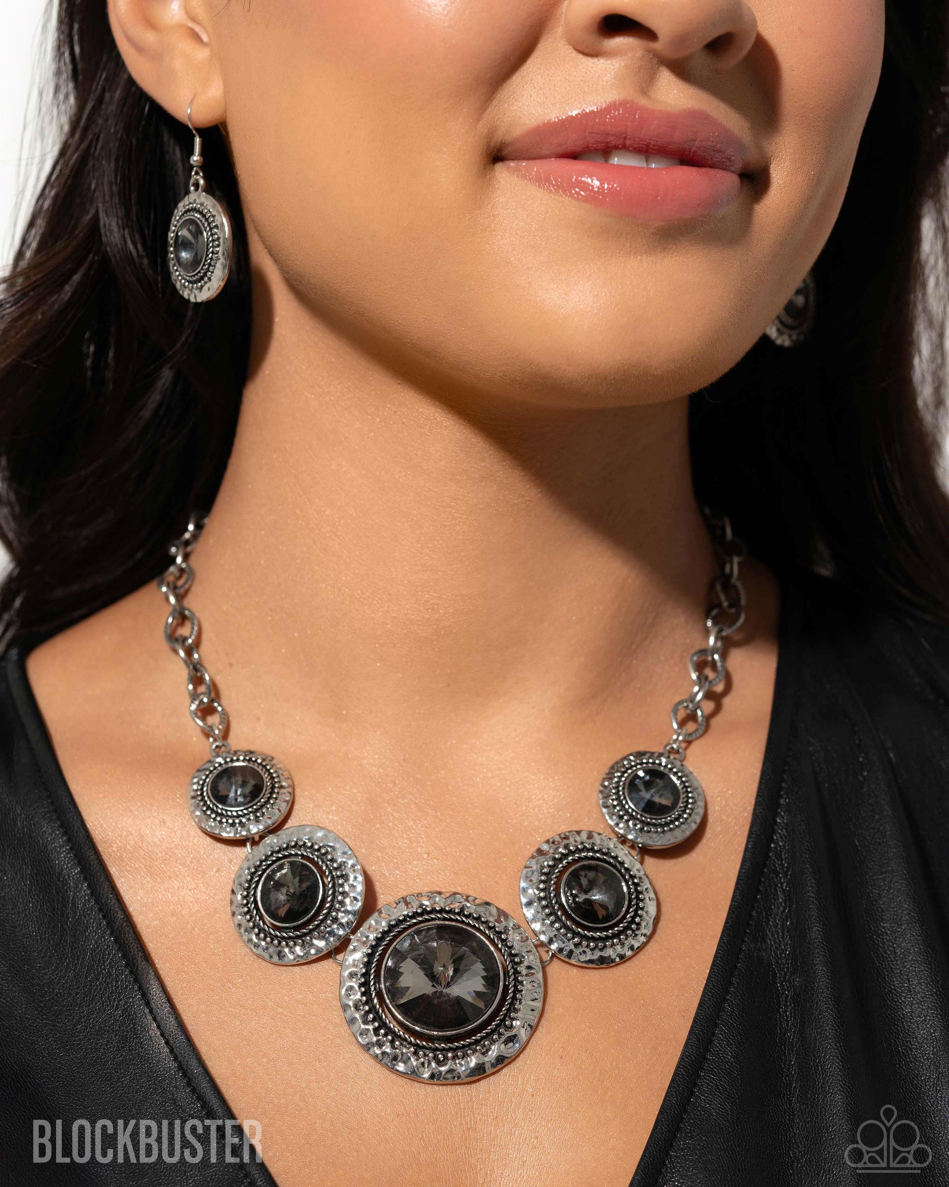 Gradually increasing in size, dramatically oversized smoky gems are pressed into the centers of hammered and silver studded frames. The blinding frames link below the collar for a glamorous, statement-making finish. Features an adjustable clasp closure.