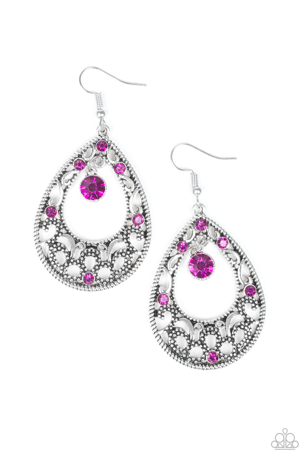 Glistening and studded silver filigree swirls along a shimmery silver frame radiating with glittery pink rhinestones. A sparkling pink rhinestone swings from the top of the frame for a refined finish. Earring attaches to a standard fishhook fitting.