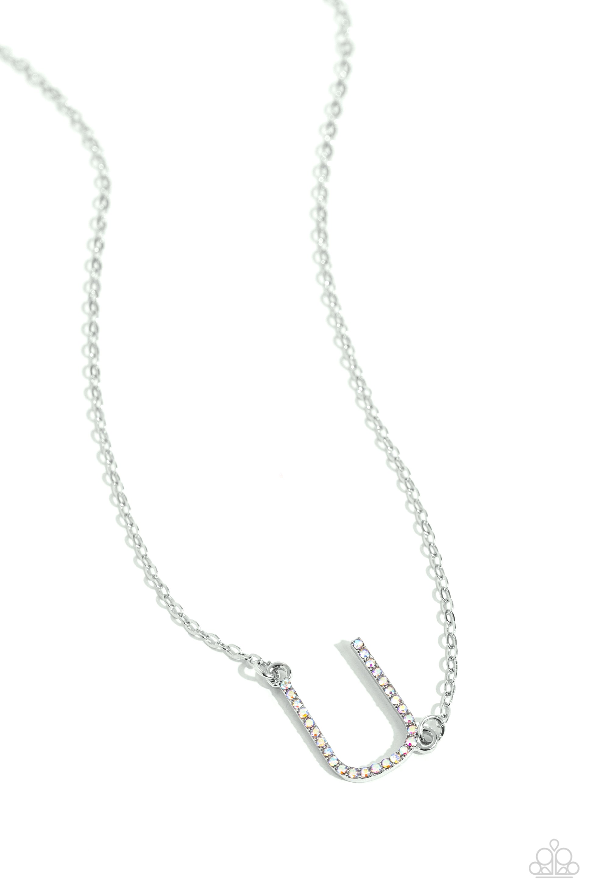 Embossed with dainty iridescent rhinestones, a silver letter "U" hovers below the collar from a dainty silver chain, for a sentimentally simple design. Features an adjustable clasp closure. Due to its prismatic palette, color may vary.