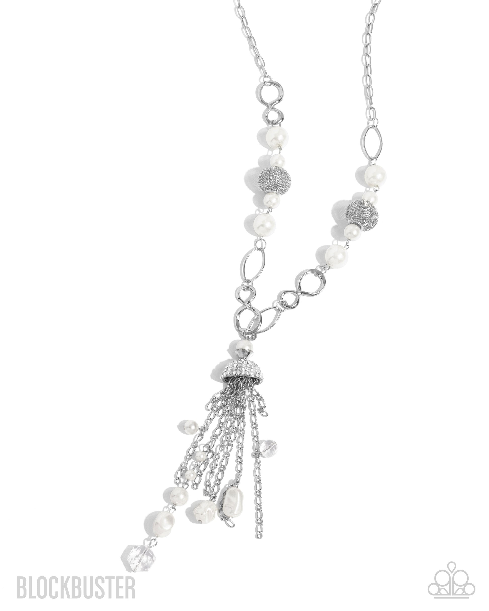 A half-shell studded in rhinestones overhangs a cluster of ivory pearls, tassels of silver chain, and small crystals. Two large wire mesh spheres and larger ivory pearls decorate the neckline.