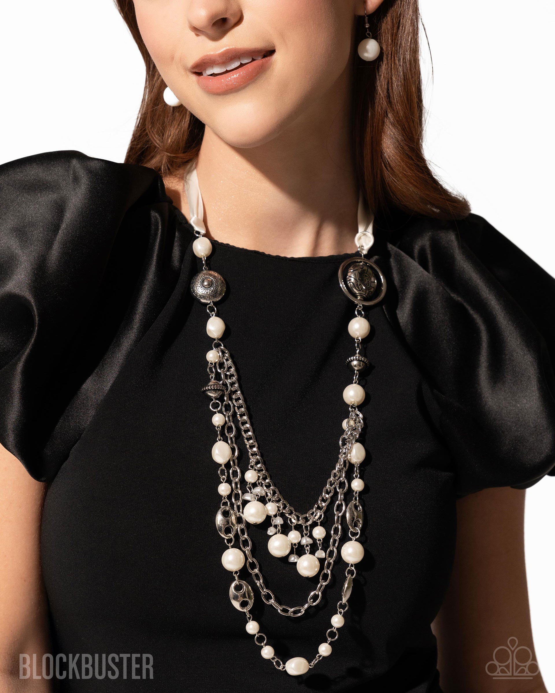 Replacing a traditional chain, a knotted, silky ivory ribbon gives way to textured silver discs, ivory classic and baroque pearls, rope-textured silver beads, silver tabs, silver cable chain strands, and chunky silver curb chain strands that cascade, intermix, and layer below the neckline for an opulent one-of-a-kind look.