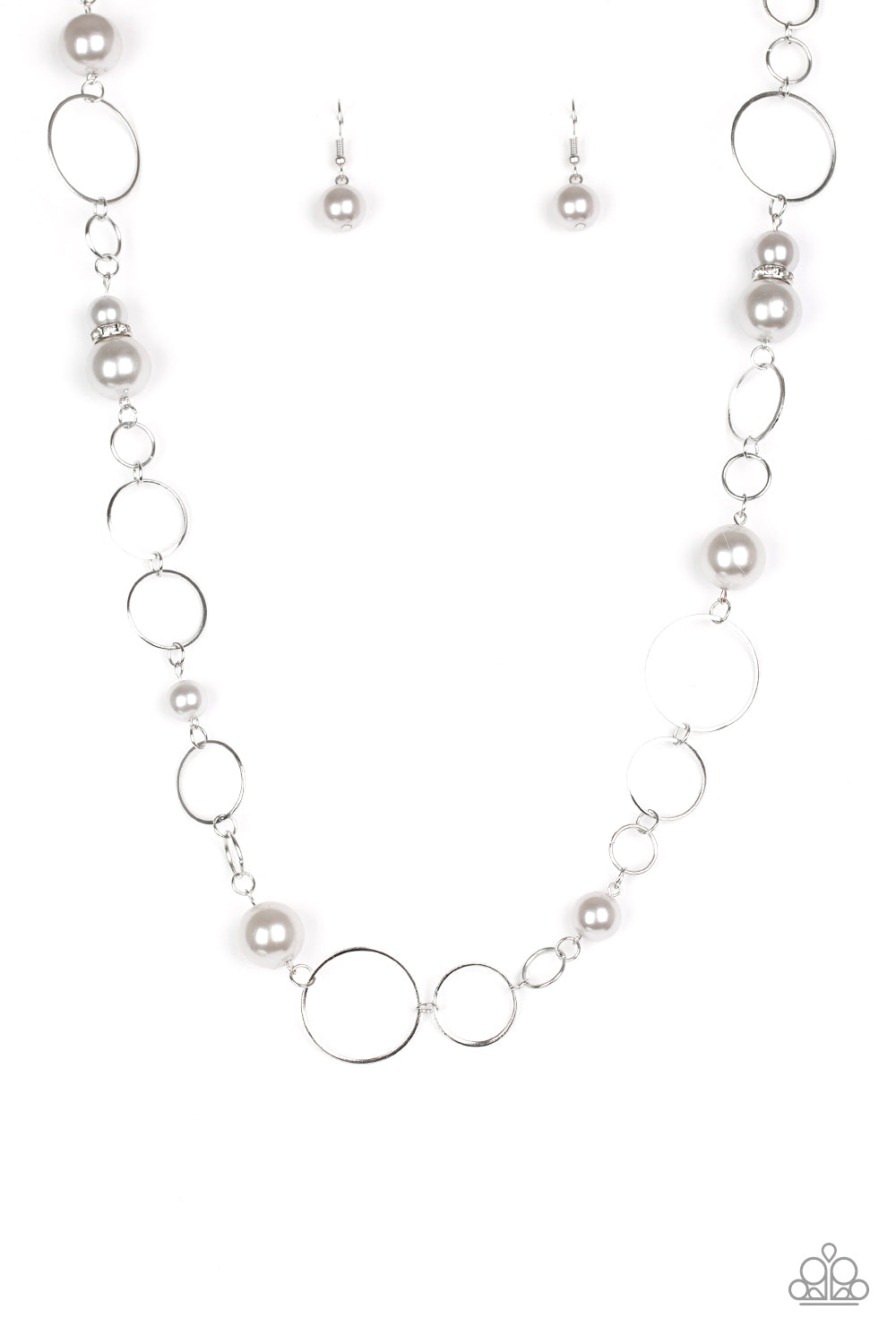 Bubbly silver pearls and white rhinestone encrusted rings join mismatched silver hoops across the chest for a glamourous fashion. Features an adjustable clasp closure.