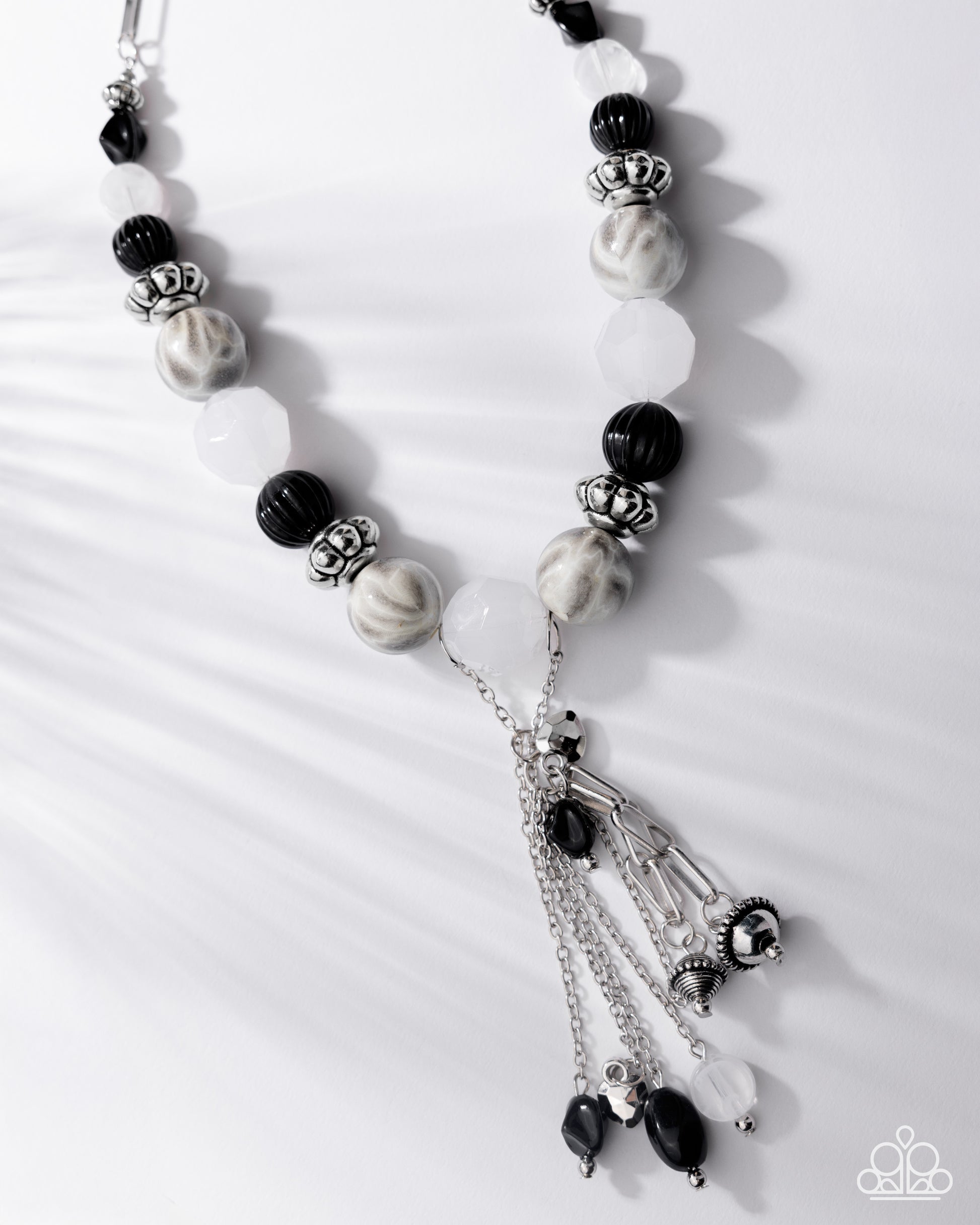 Giving way from a silver paperclip chain, a collection of textured silver beads, defaced milky white beads, chiseled black beads, pleated linear-textured black beads, and abstract gray-striped beads alternate in an eclectic pattern below the neckline. A tassel of dainty silver chains and paperclip chains in various lengths is decorated with matching abstract beads at their ends with an additional solitaire textured silver heart elevated above the tassels for a dramatic, romantic finish. Features an adjustable clasp closure.
