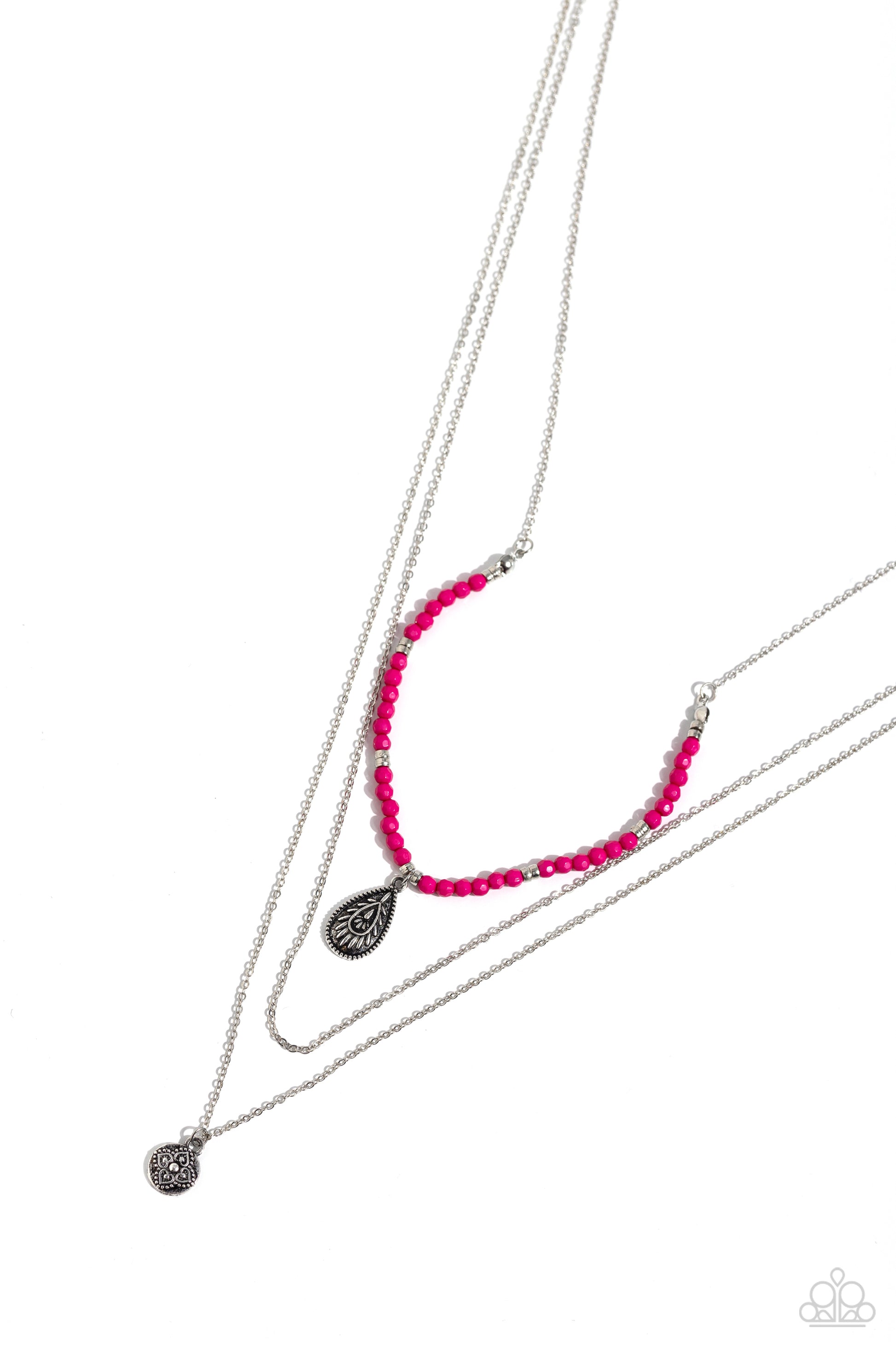 Infused with vivacious pink beading and an ornate silver teardrop pendant, a colorfully beaded strand gives way to a plain silver chain and a dainty silver chain featuring an antiqued pendant for a whimsically layered look. Features an adjustable clasp closure.