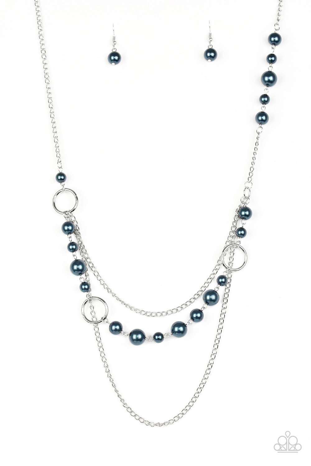 Pearly blue beads and shimmery silver hoops trickle along glistening silver chains, creating mismatched layers down the chest. Features an adjustable clasp closure.