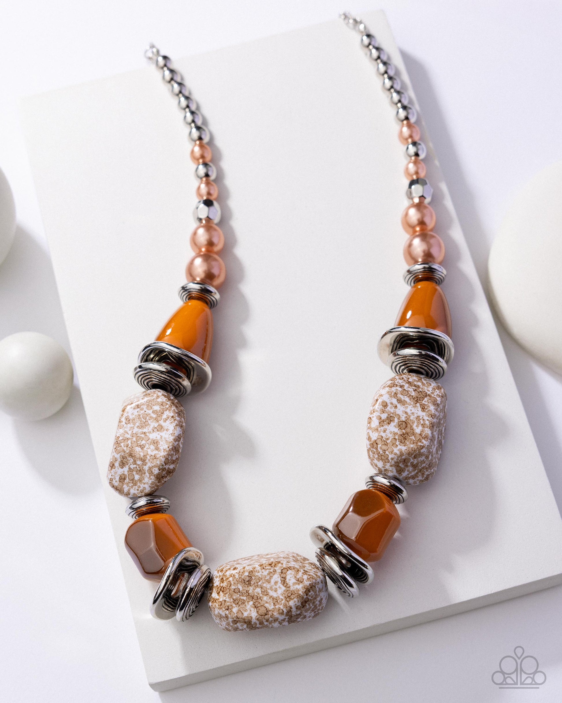 Infused along an invisible string, a collection of abstract chunky white beads with speckles of brown alternate with solitaire peachy-brown beads with a gorgeous glazed finish, round peach pearls, silver beads, doubled layers of thick textured silver rings, and defaced silver beads, creating an eye-catching, engaging display along the neckline. Features an adjustable clasp closure.