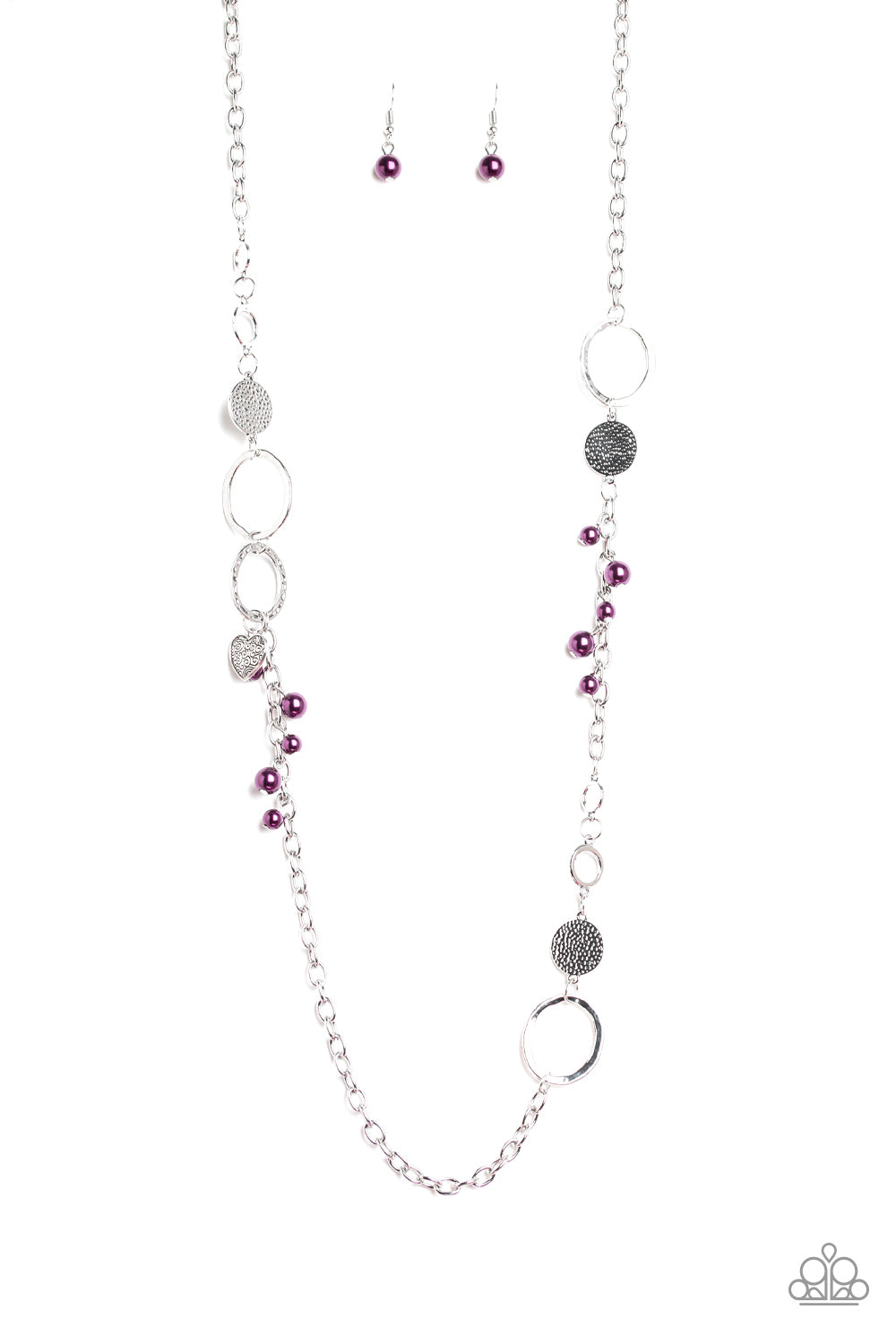 Infused with sections of shimmery silver chains, an assortment of hammered silver discs and silver rings link across the chest. A collection of pearly purple beads and dainty silver heart charms asymmetrically dot the glistening piece for a flirty finish. Features an adjustable clasp closure.